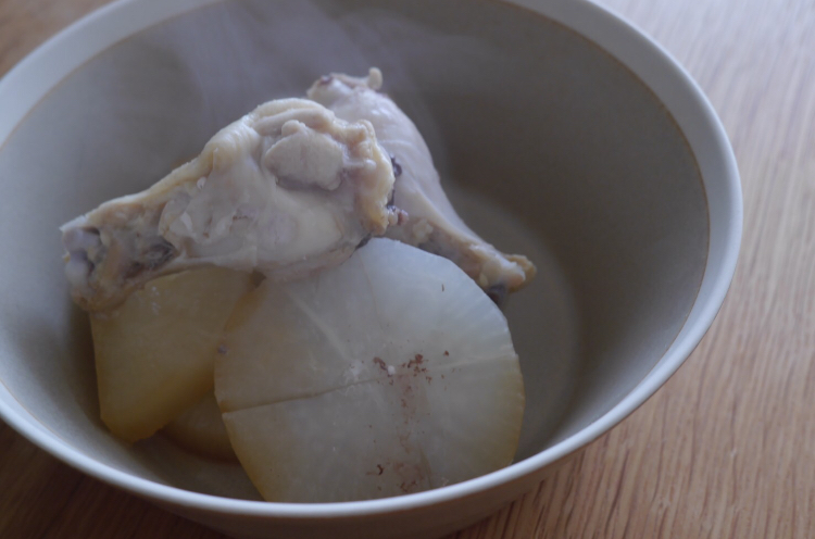 ①大根は輪切りにして表面に浅く十字の切り込みを入れて、鍋に米を数粒入れた水で30分煮込みます。