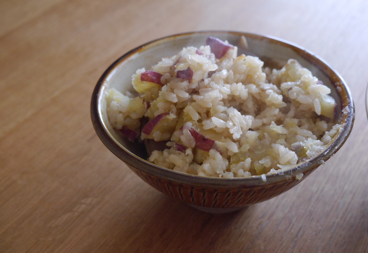 お米2合に半月切りにしたさつまいもとと舞茸を一緒に入れて、醤油大さじ1、みりん大さじ1、和風出汁を入れて炊飯器の炊き込みモードで炊いて完成です。