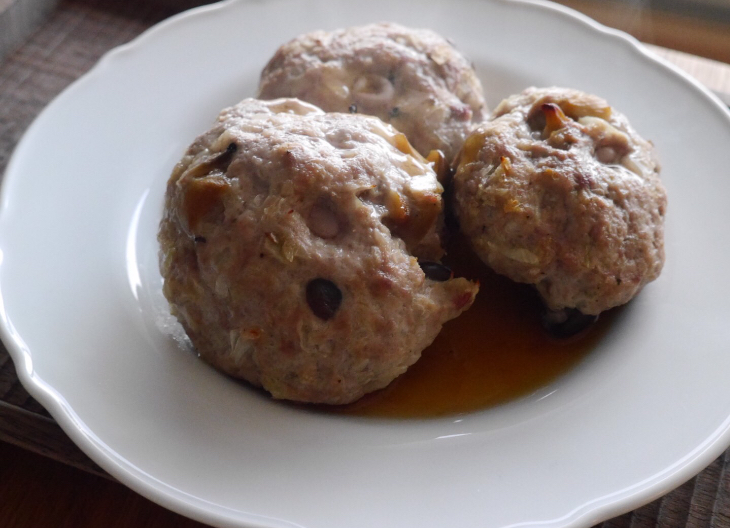 ④オーブンの鉄板に並べた肉タネをオーブンで焼きます。200°で30分焼いて、③をかけて完成。