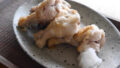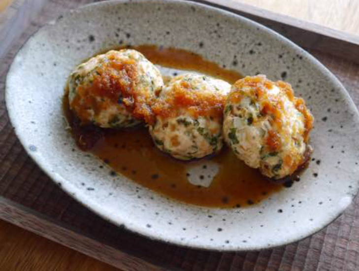 ③焼きあがったつくねに生姜ソースをかけて完成。