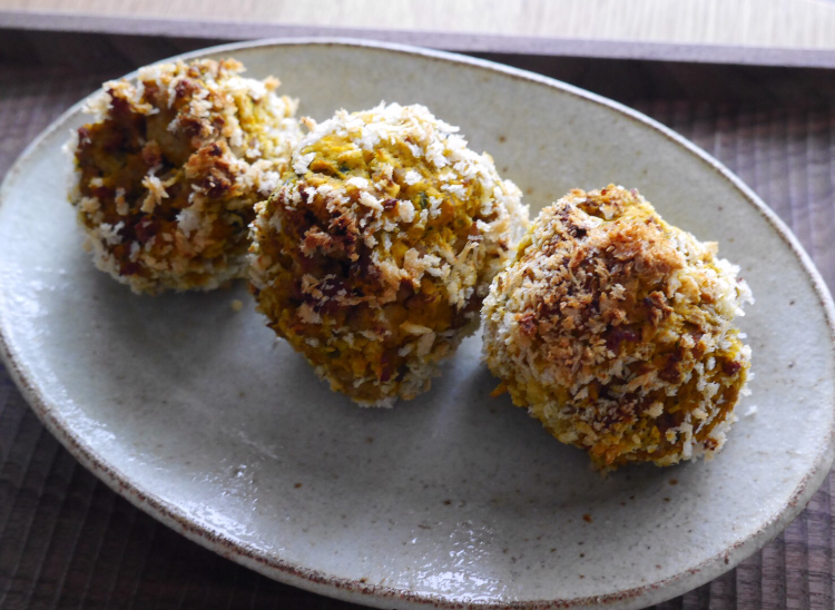 ④水で溶いた米粉→パン粉の順番につけて200°のオーブンで20分焼いて完成。