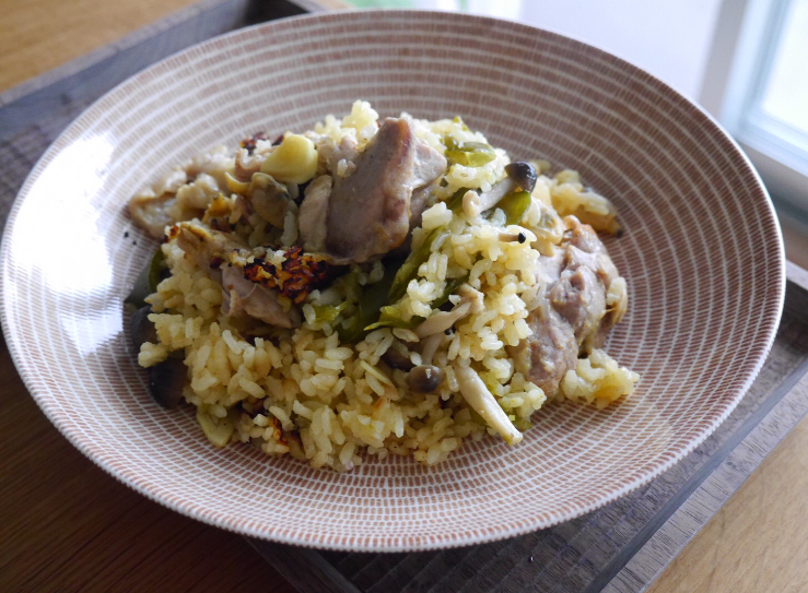 ②白ワイン100ml、水260ml、しめじ、輪切りにしたにんにく、一口サイズにカットした鶏もも肉、細切りしたピーマン、冷凍エビ、あさり、野菜ブイヨン、ケチャップ大さじ2、カレー粉小さじ1を入れて鍋蓋を閉めて中火で20分加熱。加熱後火を消して蓋を閉めたまま15分蒸らして完成。