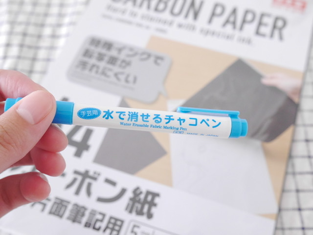 1色という点がハードル低くなりますよね。手ごろで身近な刺繍糸(100円均一)と学生時代に使っていた裁縫セットを片手にチクチク縫い始めました。わたしは、チャコペーパーが手に入らなかったので、これまた100円均一で購入したカーボン紙と、100円均一のペン(布に書けて水で消せる裁縫用)を使って図案をうつしました。うつすのは、クッキングペーパーです。