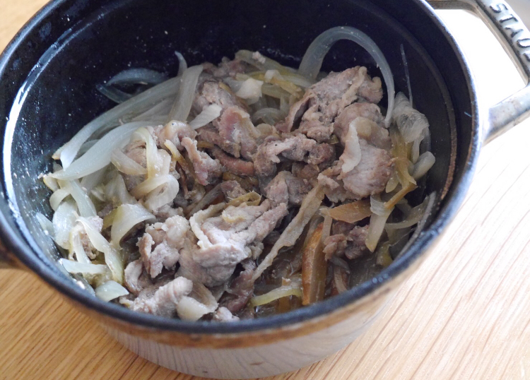 ②櫛切りにした玉ねぎをストウブに入れて塩を振って解凍した①を汁ごと入れます。鍋蓋を閉めて中火で10分加熱して完成。