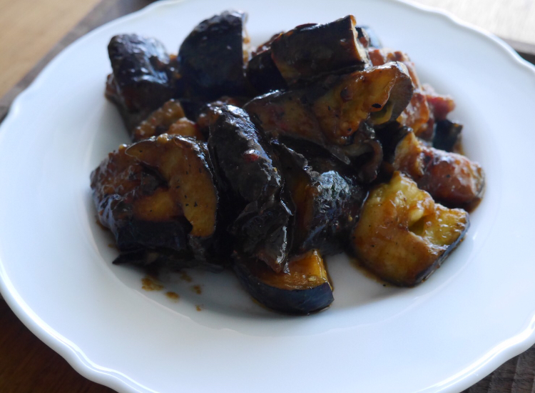 ②ナスを半月切りにして、塩と多めの片栗粉をつけて菜種油を多めに入れた鍋にいれて蓋をしめて5分加熱します。豚バラ肉をナスの上において蓋を閉めてさらに10分加熱。途中①の漬け汁を入れて混ぜ合わせます。