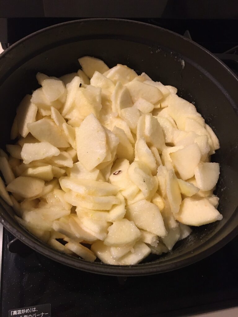 りんごの皮をむき薄くスライスして、分量通りの砂糖とレモン汁をからめて10分置きます。