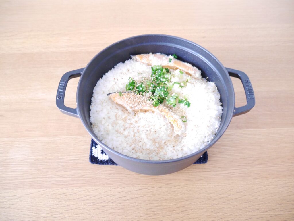 材料は鮭2切れ、お米5合、生姜のすりおろし、だし汁(昆布だし)900mlを使用します。最初に昆布だしをとります。簡単な昆布だしのとりかたは、昆布10gを水を約1ℓに浸して30分置いておき、火にかけて昆布からブクブクを泡がでてきたら火をとめて完成。続いて昆布だし900mlにお米5合を入れて30分浸しておきます。最後に生姜、塩小さじ1、鮭、を入れて中火にかけて、鍋から湯気が出てきたら弱火にして10分火にかけた後、10分蒸らしました。仕上げに刻みネギと白ごまをふって出来上がり。