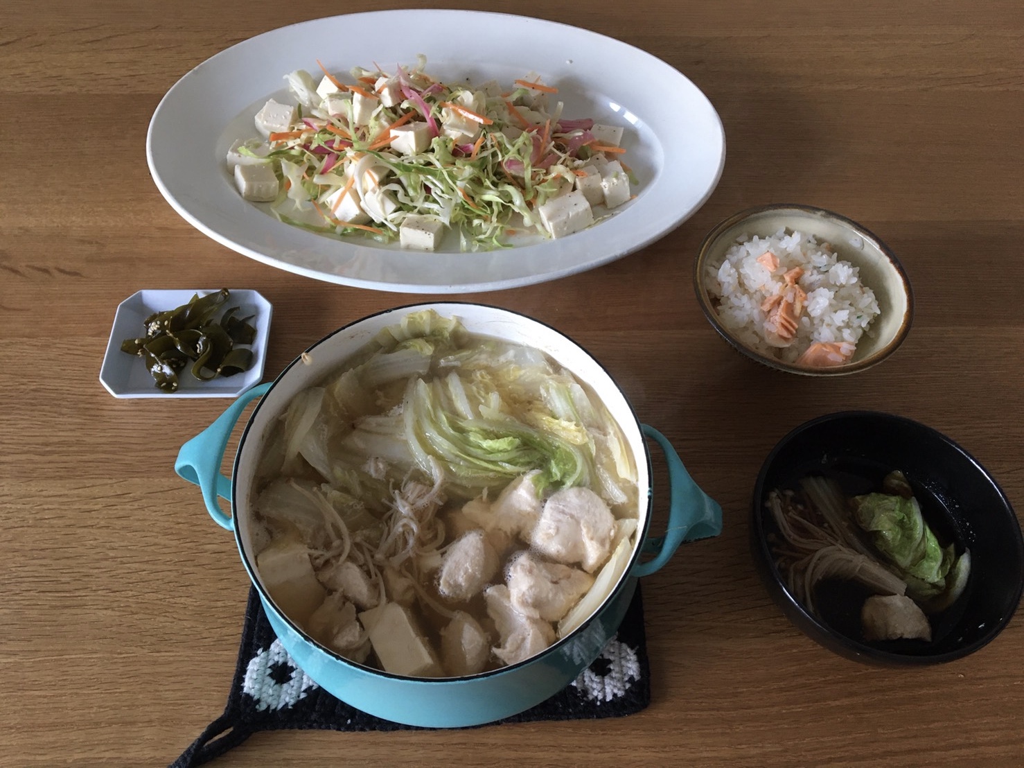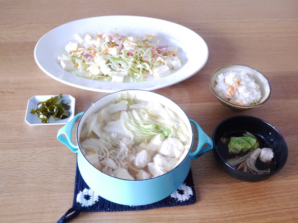 | お鍋・豆腐サラダ・鮭の炊き込みご飯 昆布の佃煮 | シロクマと一緒のメニュー |