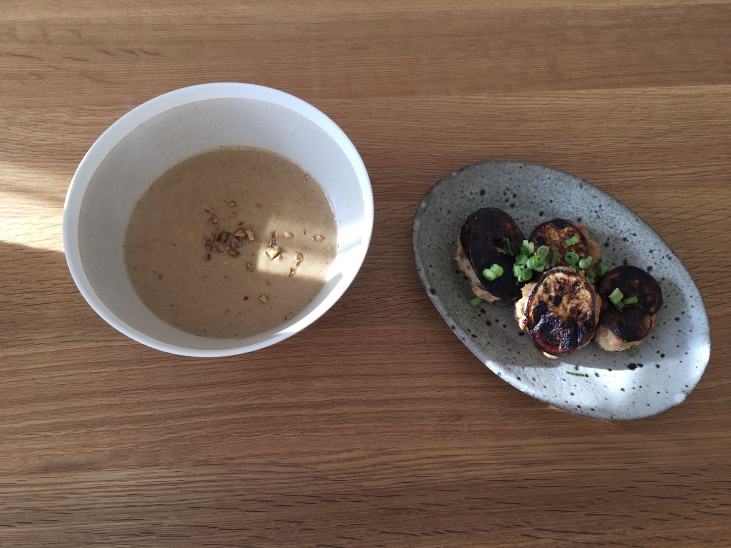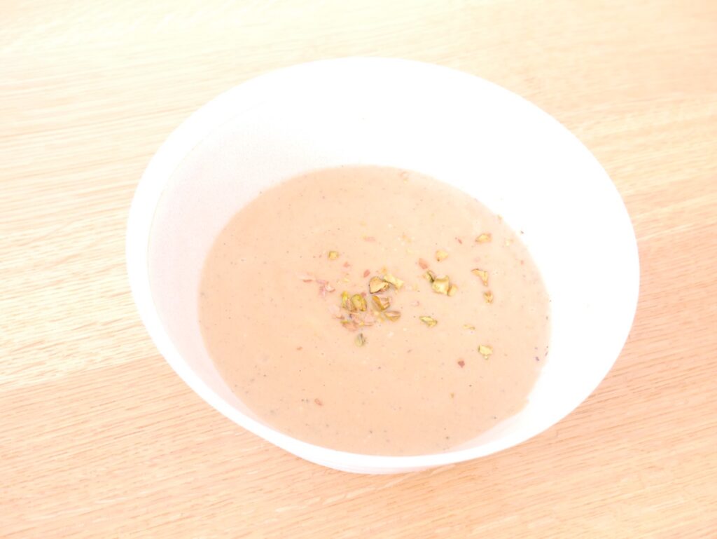▲白いスープのはずが…焦がしました。仕上げにピスタチオをのせてみた。