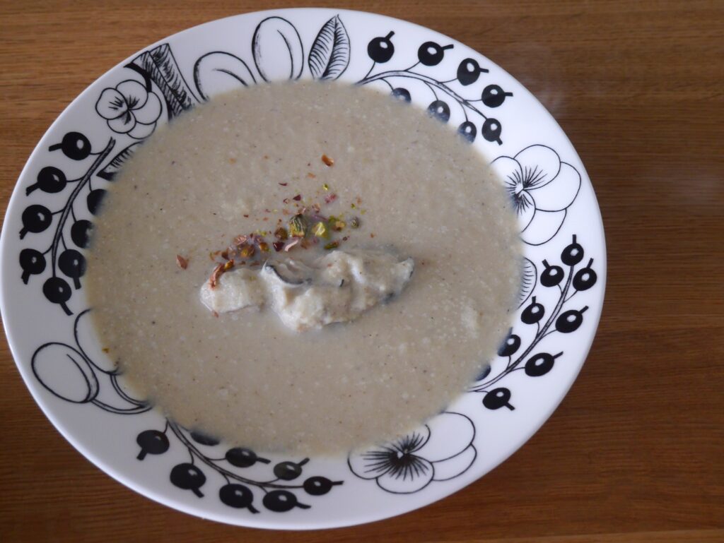 大鍋の野菜をブレンダーで攪拌して、最後に軽くお湯で霜取りをした牡蠣と牛乳200mlを入れて15分ほど煮たら完成。
