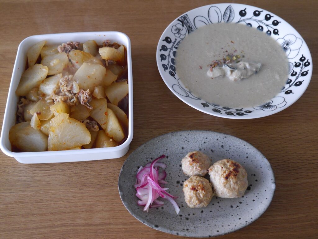 大根と牛肉の甘辛煮・チーズハンバーグ 野菜サラダ・牡蠣とセロリのスープ 焦がしキャラメルとラム酒漬けイチジクのケーキ | シロクマと一緒のメニュー・白米 |