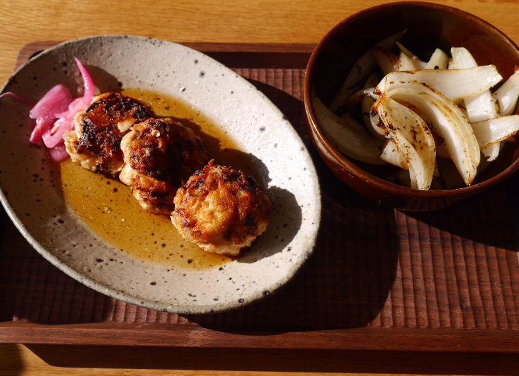 甘酢タレのつくね・フライドオニオン コールスロー・揚げ浸し ラム酒のパウンドケーキ | シロクマと一緒のメニュー・白米 |