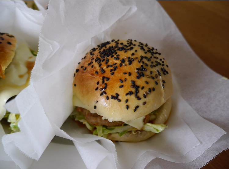 焼きあがったバンズを横から半分にカットして春キャベツをマヨネーズと塩コショウで和えたものと照り焼きソースをくぐらせたハンバーグ、チーズ、を挟んで完成。