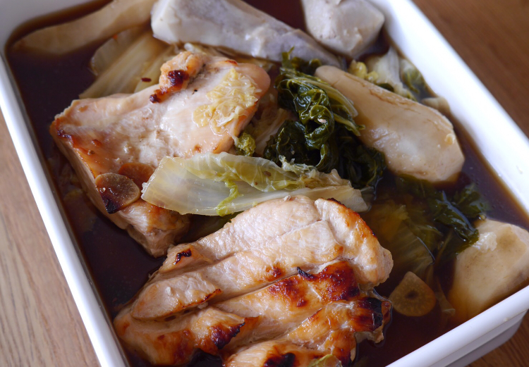 5分漬け込んだ鶏肉を200°のオーブンで20分焼いて、大鍋に蒸した里芋とざく切りにした白菜と鶏肉を入れます。