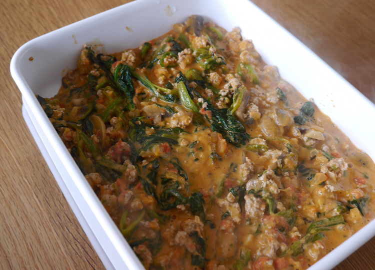 ピザソース(トマト缶と玉ねぎ、にんにくを塩コショウで煮詰めたもの)生クリーム50ml・豚ひき肉・ほうれん草・マッシュルーム(前日のピザで使った残りもの)