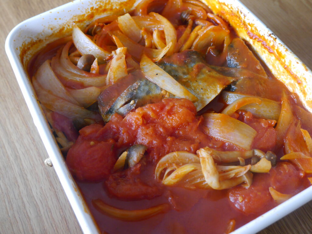 鯖を味を漬け込んだ汁と鯖とトマト缶、赤ワイン小さじ2、鶏ガラ粉末小さじ1、塩コショウ、ケチャップ大さじ2を入れて20分煮込んで完成。