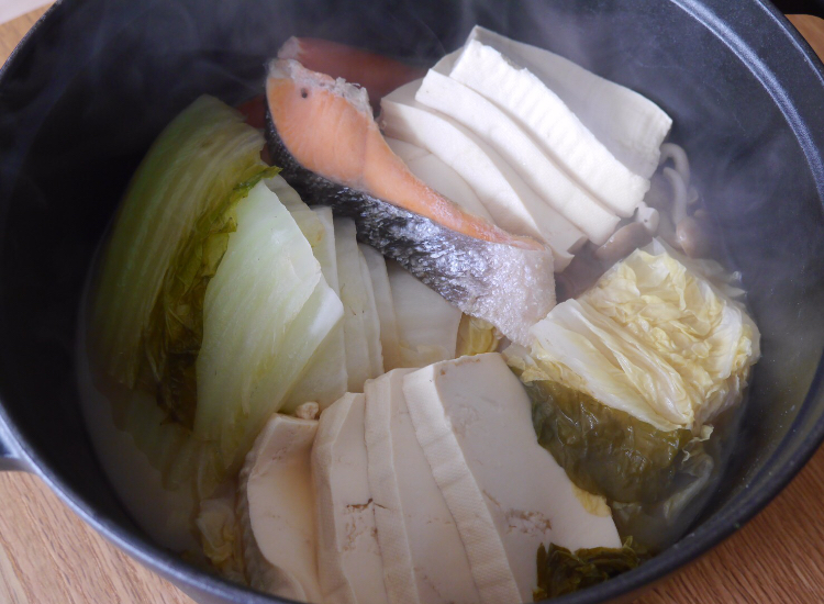 白菜・豆腐・しめじ・鮭1切れ・ソーセージ・レモン汁・バター20g。