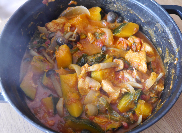 かぼちゃ・玉ねぎ・しめじ・トマト缶1・バター10g・鶏むね肉(一口サイズにカットしてカレー粉小さじ2・トマトケチャップ大さじ2・砂糖小さじ1・塩小さじ1・ヨーグルト大さじ2を揉みこんでおきます)。