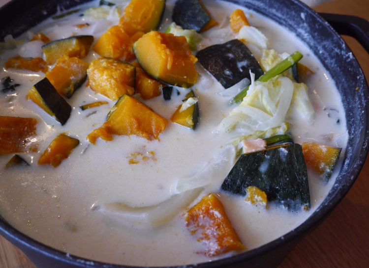 白ワイン50ml・鮭二切れ・かぼちゃ・玉ねぎ・小松菜・白菜・牛乳800ml・バター10g。