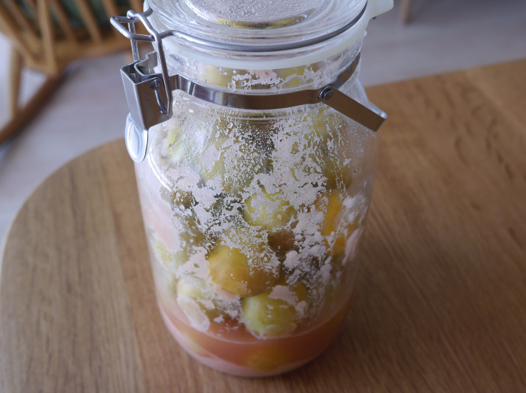 一日1回、梅酢を全体にいきわたらせるように優しく瓶をひっくりかえします。