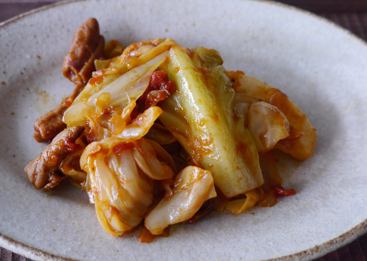 蒸したキャベツの鍋に解凍した豚もつ、トマト缶、カレー粉小さじ1、ケチャップ大さじ3、はみちつ大さじ1を入れて食材の水分を飛ばしきるまで煮込んで完成。