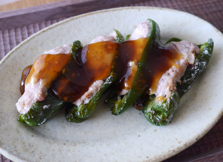 焼きあがったピーマンの肉詰めにタレをかけて完成。