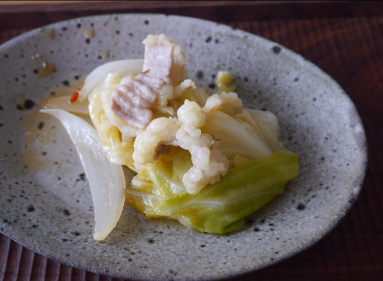 ①キャベツをざく切り、玉ねぎを櫛切りにして、大鍋に水100mlと塩少々を入れて切った野菜を入れて鍋のフタを閉めて5分煮ます。